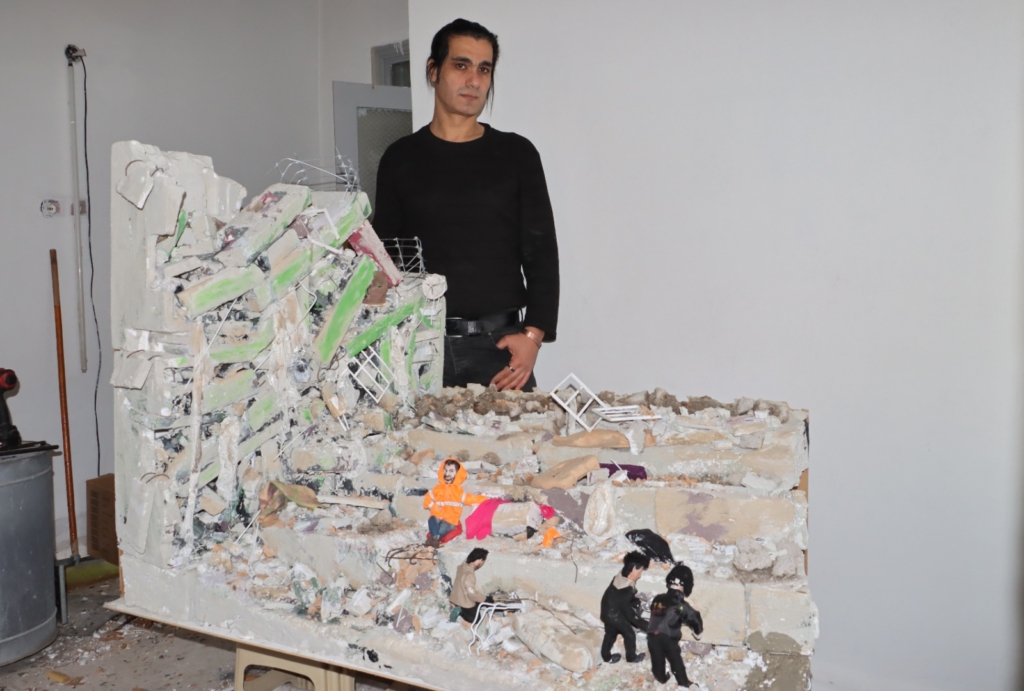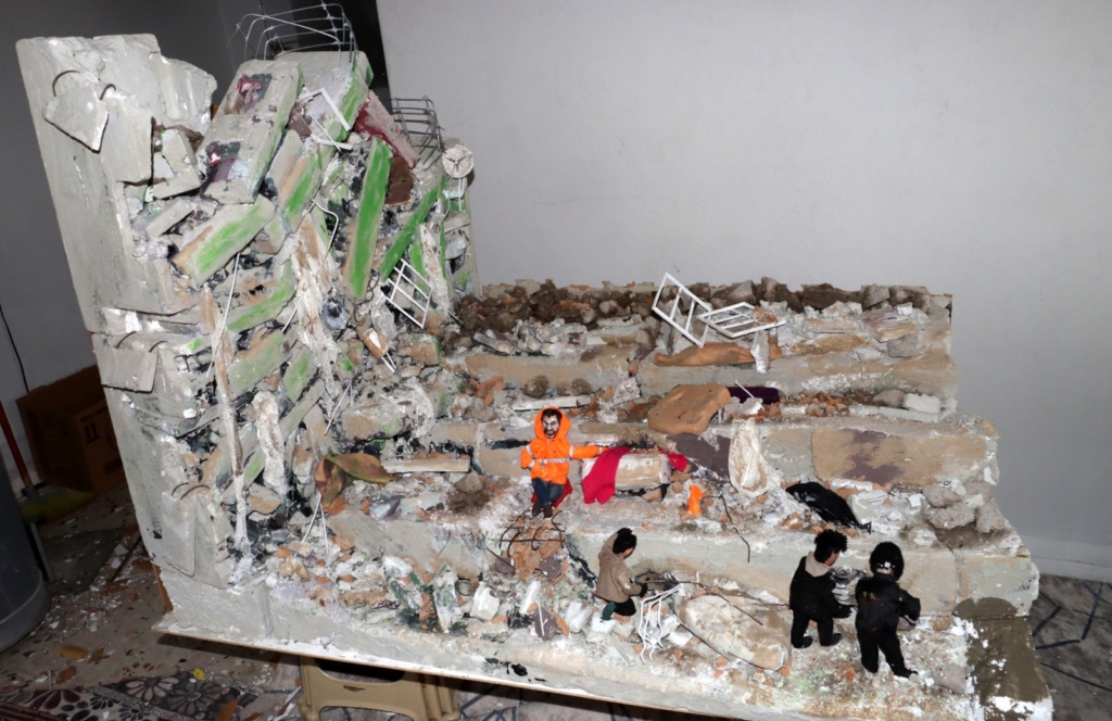 Altınözü ilçesindeki atölyesinde sergilenen deprem maketini yalnızca 3 gün gibi kısa bir sürede hazırladığını belirten sanatçı Mehmet Kocaman, duygularını şu sözlerle dile getirdi: “Yaşanan acı gerçekten çok büyüktü ve hepimizi derinden etkiledi. Uzun zamandır depremle ilgili bir çalışma yapmayı planlıyordum. Geçtiğimiz günlerde böyle bir eser yapmaya karar verdim. Basında yer alan deprem karelerinden esinlenerek ortaya çıkardığım çalışmanın her detayını yerleştirirken çok duygu dolu anlar yaşadım.